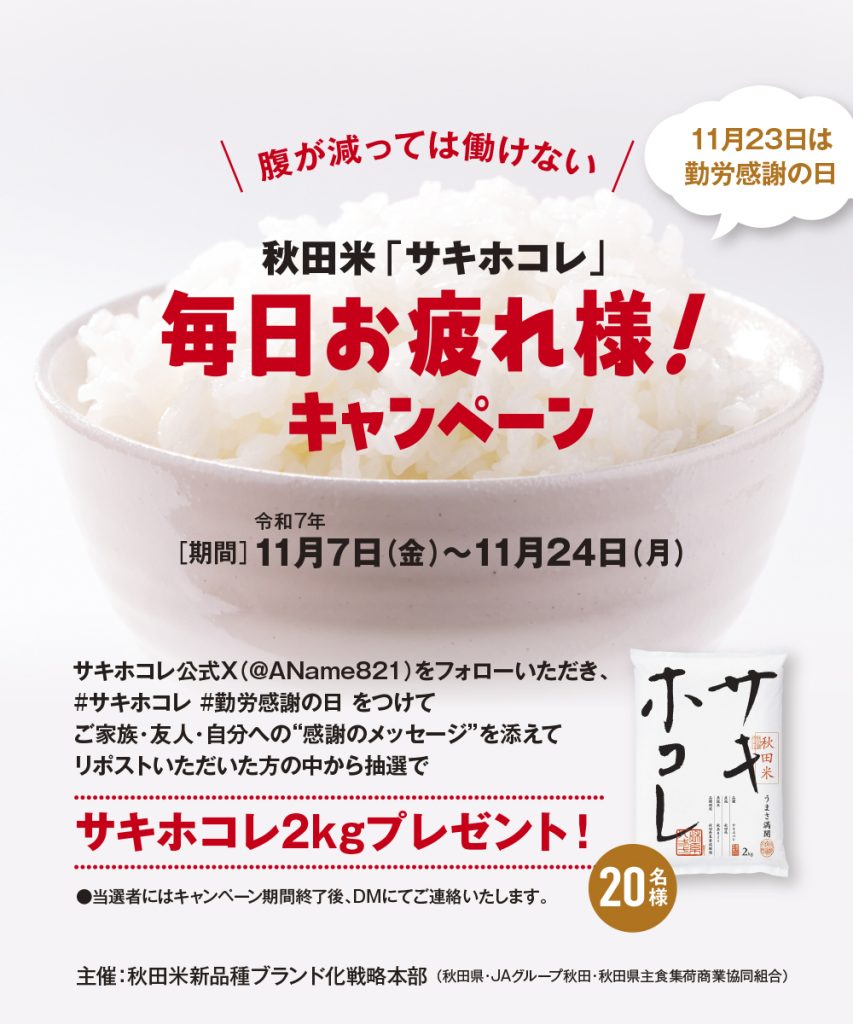 秋田県では、腹が減っては働けない!秋田米「サキホコレ」毎日お疲れ様!キャンペーンを【公式】Xで、2025年11月7日(金)~2025年11月24日(月)の期間実施いたします。