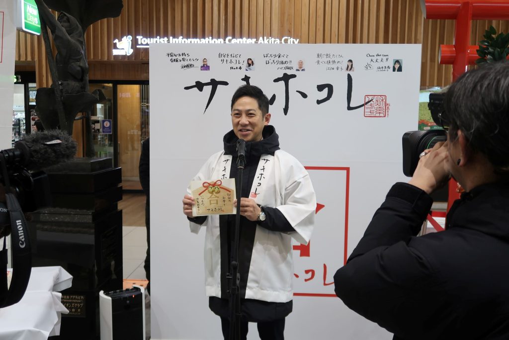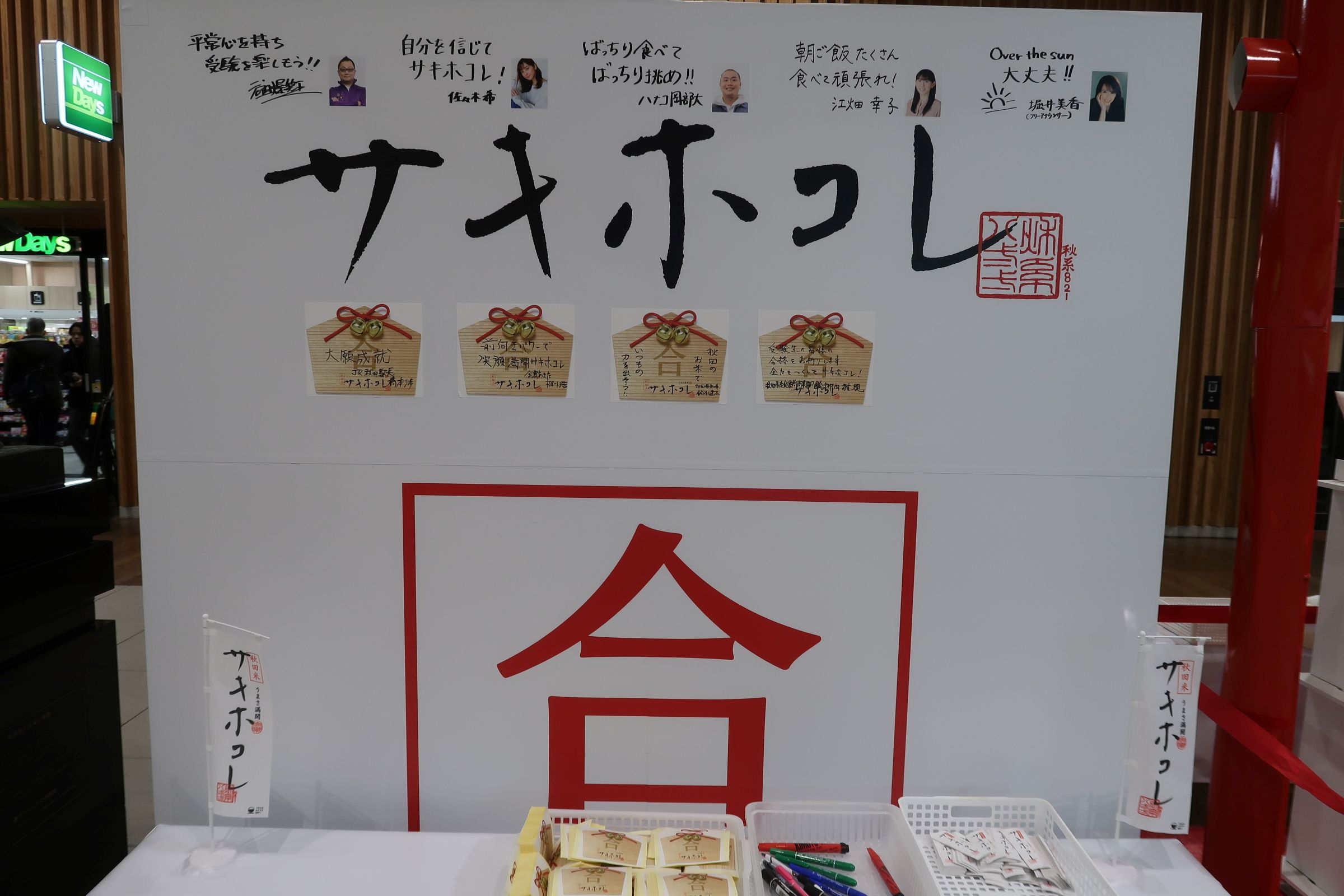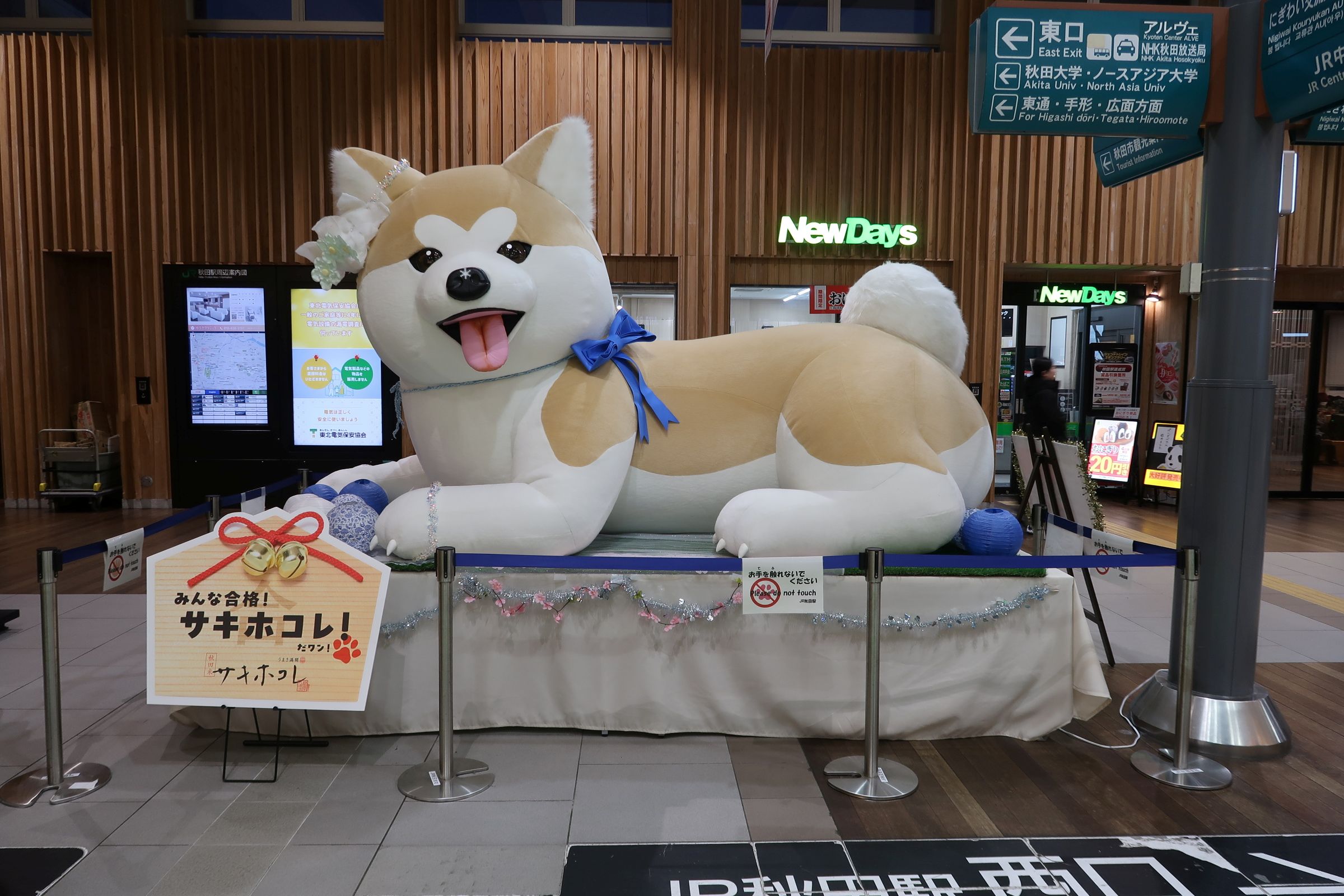 JR秋田駅でサキホコレ合格祈願祭を開催しました。 3/23まで改札口前に鳥居と合格祈願メッセージボードを設置していますので、絵馬シールに願い事を書き込み、ボードに貼り付けて合格祈願をしてください! 鈴木知事や壇蜜さん、サキホコレアンバサダーの皆さまからの応援メッセージも見られますよ。