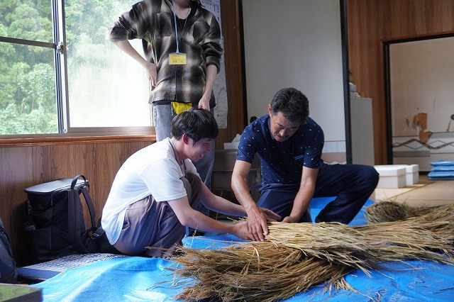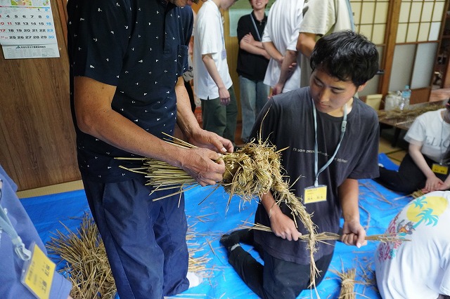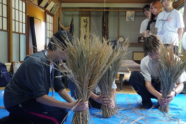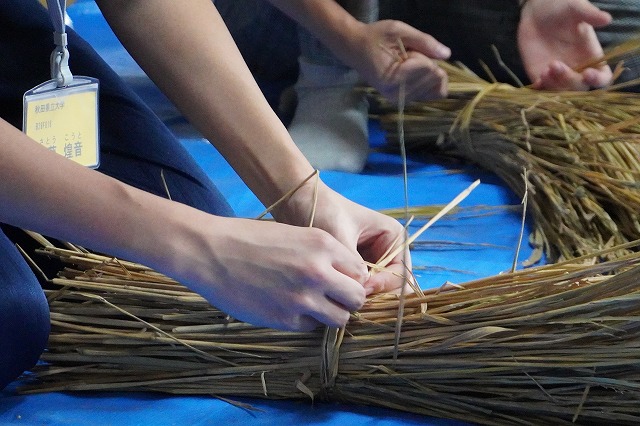 鎌田会長の指導を受け、藁を編んでいく学生たち。もしかして藁にさえ触れたことのない学生さんが、ほぼ皆さん初体験のケラ編みを真剣に取り組んでいました。会長の指導も分かりやすかったのか、初めてでもなんとか完成にこぎつけましたよ。童心に返ったように、無邪気な様子で藁を編んでいく学生たちがとても印象的でした。