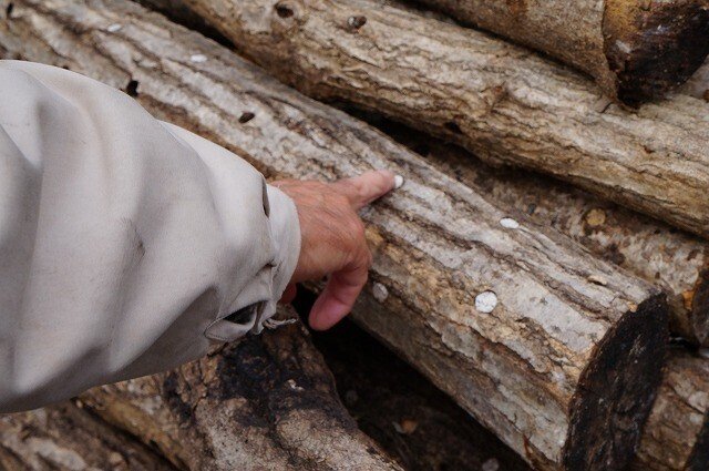 1~3月に植菌した原木を、5月になるとホダ場へ運びます。ホダ場に1年~1年半近く置き、菌が原木にいきわたるようにします。現在、ホダ場には2500本ほどの原木があります。この中から130本ほど、ハウスへ運んできます。