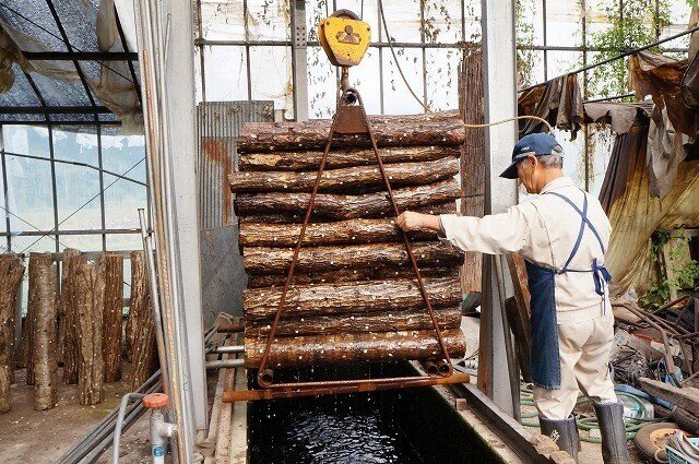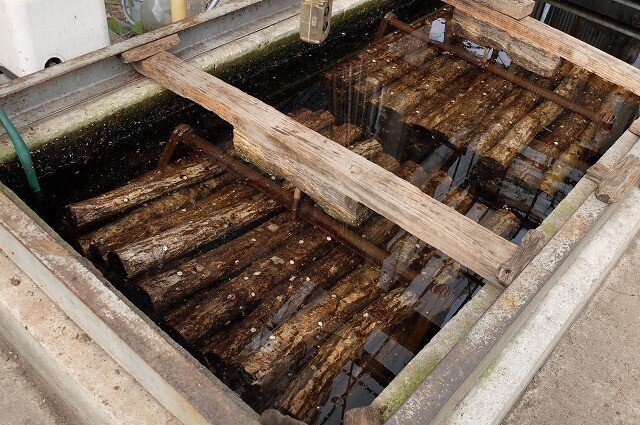 ホダ場から持ってきた原木を水槽に漬けること約10日間(夏場は1週間)、その後取り出し、ハウス内の棚に陳列します。