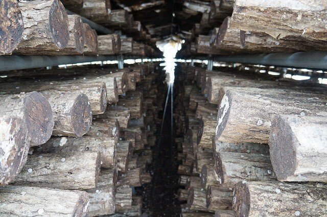 しいたけが植菌されている原木を置いているビニールハウス