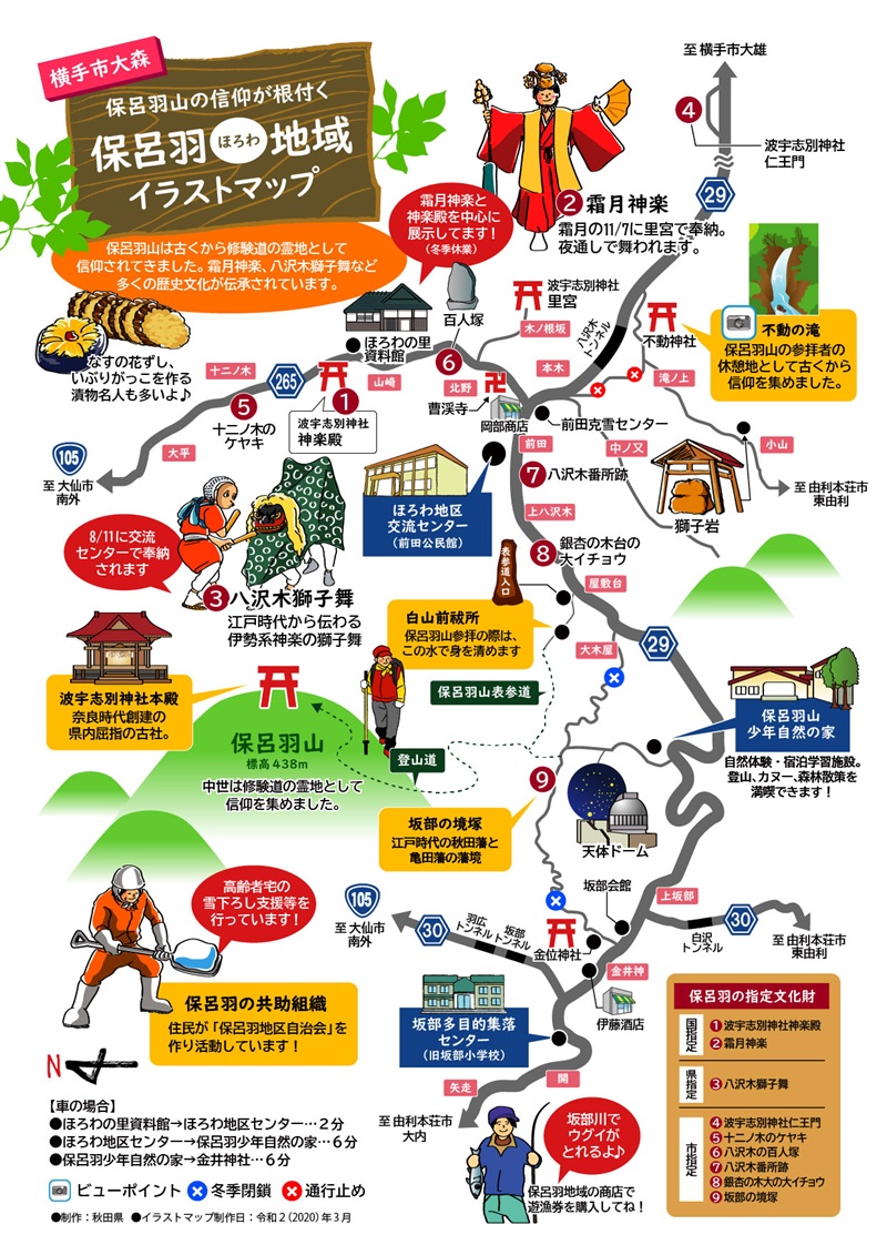 地域のシンボル「保呂羽山」は、かつて女人禁制の山でした。山頂には奈良時代創建の「波宇志別(はうしわけ)神社」があり、修験道の霊地として信仰されてきました。麓の里宮で11月に行われる「霜月神楽」は、国の無形民俗文化財に指定されています。この他にも、国有形文化財「波宇志別神社神楽殿」県無形民俗文化財の「八沢木獅子舞」と、多くの歴史文化遺産が伝承されています。