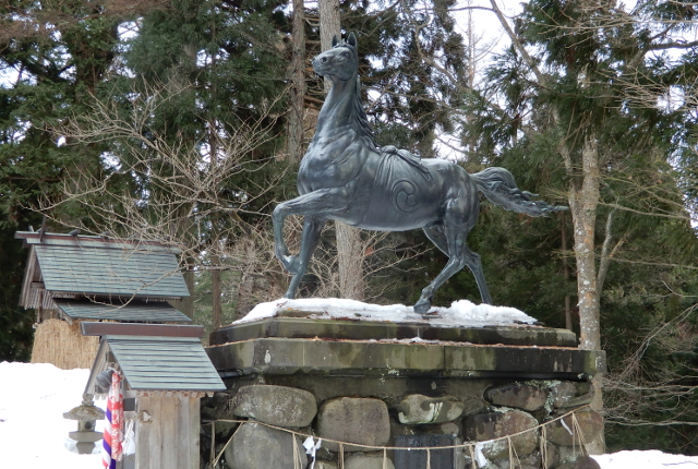 横手市金沢(かねざわ)地域の金澤八幡宮前に、日本一の青銅製の馬像と言われる「御神馬(ごしんめ)」が鎮座しています。高さ2.5m、頭から尾までの長さ3m、重さ500kgの馬像は、昭和11(1936)年4月に兵庫県の騎手、元石吉太郎...