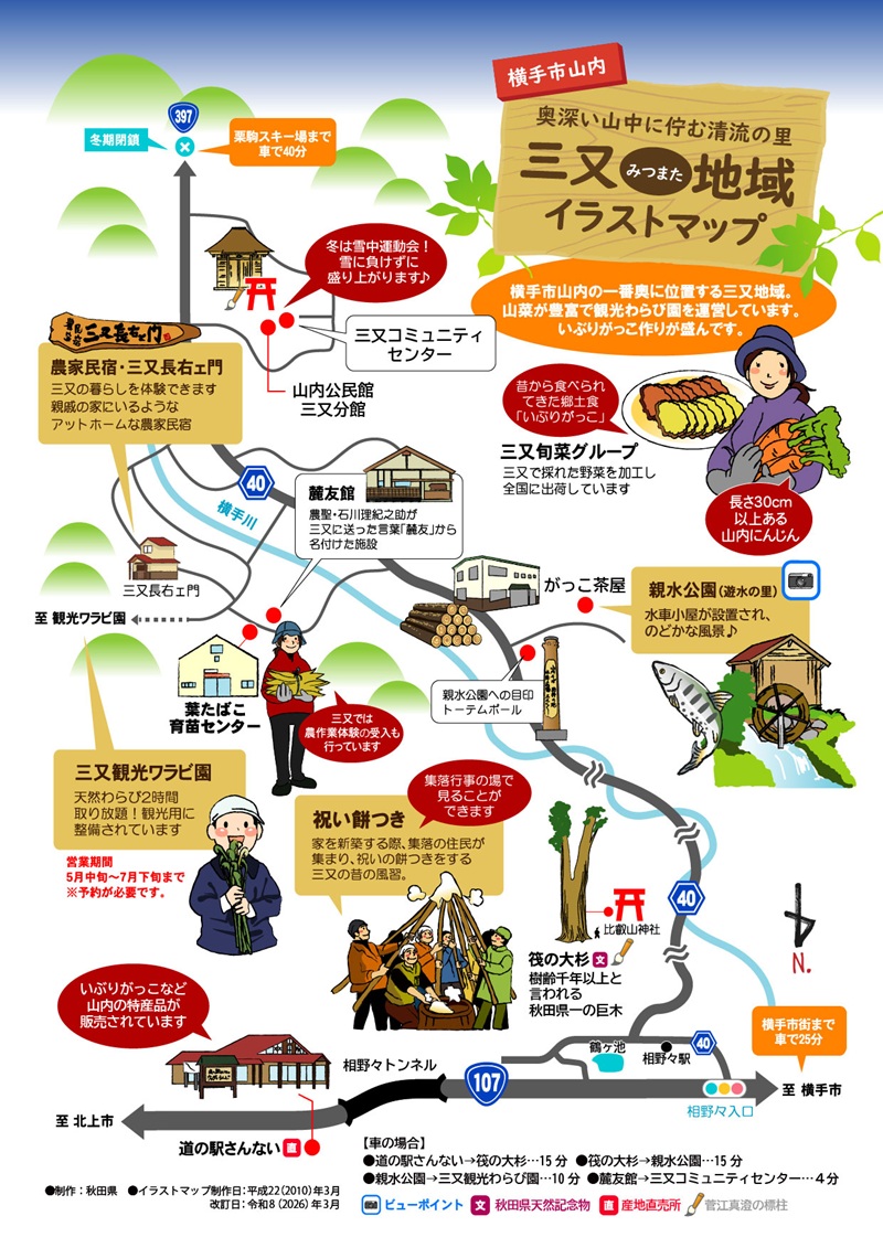 三又地域は、横手市山内地区の中心部・相野々地区から県道40号を経由し車で25分ほど、横手川上流部に沿って発達した山間にある農村集落です。稲作のほか、葉タバコ、野菜の栽培が盛んです。