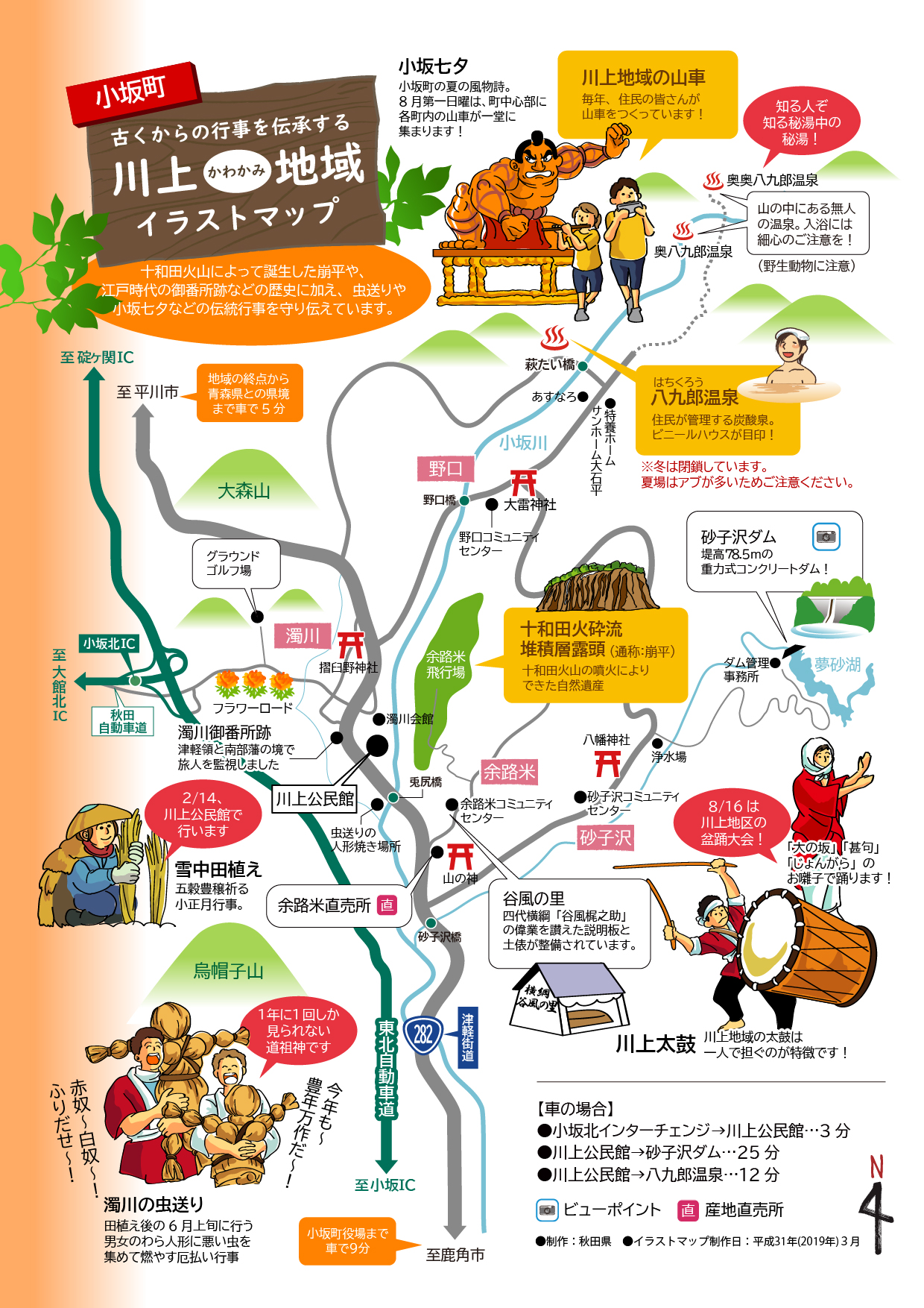 小坂町の川上(かわかみ)地域は、濁川(にごりかわ)、余路米(よろまい)、砂子沢(すなこざわ)、野口(のぐち)の4集落からなる地域で、小坂町北部に位置し、青森県平川市と隣接しています。地域を上下に貫く津軽街道は、江戸時代の参勤交代の際に使われ、津軽・秋田両藩の境目の村として、御番所が設置されました。