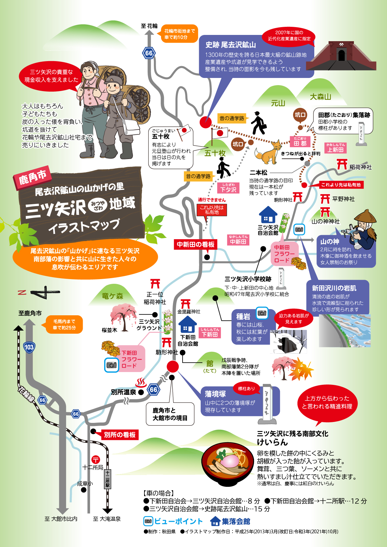 鹿角市三ツ矢沢(みつやざわ)地域の名前は「三つの谷沢」という説があります。三ツ矢沢の山向こうは尾去沢鉱山。鉱山の発達と共に集落が発展しました。鉱山で働く人と、その人々に山で作った炭や山の幸を売って生計を立てる人たち...