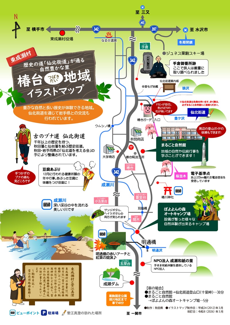 椿台(つばきだい)地域は、東成瀬村の南部、国道342号線沿いの山間に位置します。地域の真ん中を成瀬川が流れ、周囲の山々は明通橋(あけどおりばし)をはじめ栗駒山系の紅葉、渓谷美が楽しめる絶好のポイントになっています。