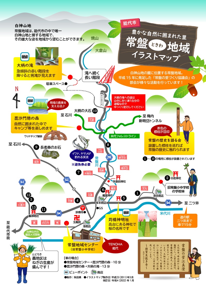 常盤地域には「房住山昔物語」に登場する長面三兄弟ゆかりの伝説が残る魔面(まおもて)神社や、江戸時代の紀行家・菅江真澄の足跡など数多くの史跡が残されています。