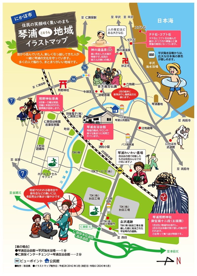 にかほ市の琴浦(ことうら)地域は、仁賀保インターチェンジからほど近い場所に位置し、地域に沿うように国道7号が通っています。大きな工場や店舗が数多くあります。
