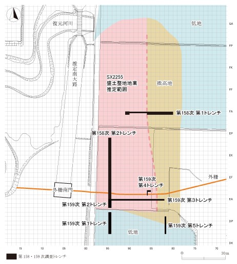 SX2255盛土整地地業の北端は、第157次調査の土層から、復元河川の周辺と考えられます。西端は第158・159次調査第2トレンチより西側と考えられますが、既に復元整備が完了していることから新たな調査が難しく、外柵南門および推定南大路との関係も確認できていません。盛土整地地業が確認された微高地の東側には、河川跡および低湿地が広がっていることが予想されるため、この微高地全体を利用するために盛土整地が行われた可能性が高いと考えられます。しかし、今回の調査区内では、盛土整地面を掘り込む明確な古代の遺構は確認されませんでした。盛土整地後に構築された建物等の遺構が存在するならば、SX2255盛土整地地業中心部である可能性が高いと思われます。