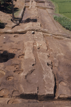 このように、築地塀と材木塀が連続するのが創建時の外郭線の姿で、9世紀中頃に築地塀が倒壊した後は、残った積み土の上から溝を掘り、その中に材木塀が建てられました。