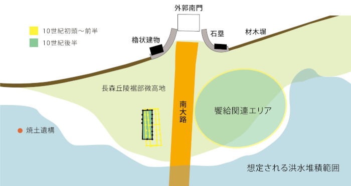 10世紀後半、河川の洪水により、大溝と盛土整地は堆積層に覆われますが、その後も何らかの活動を行っていたと思われる焼土遺構が見つかっています。