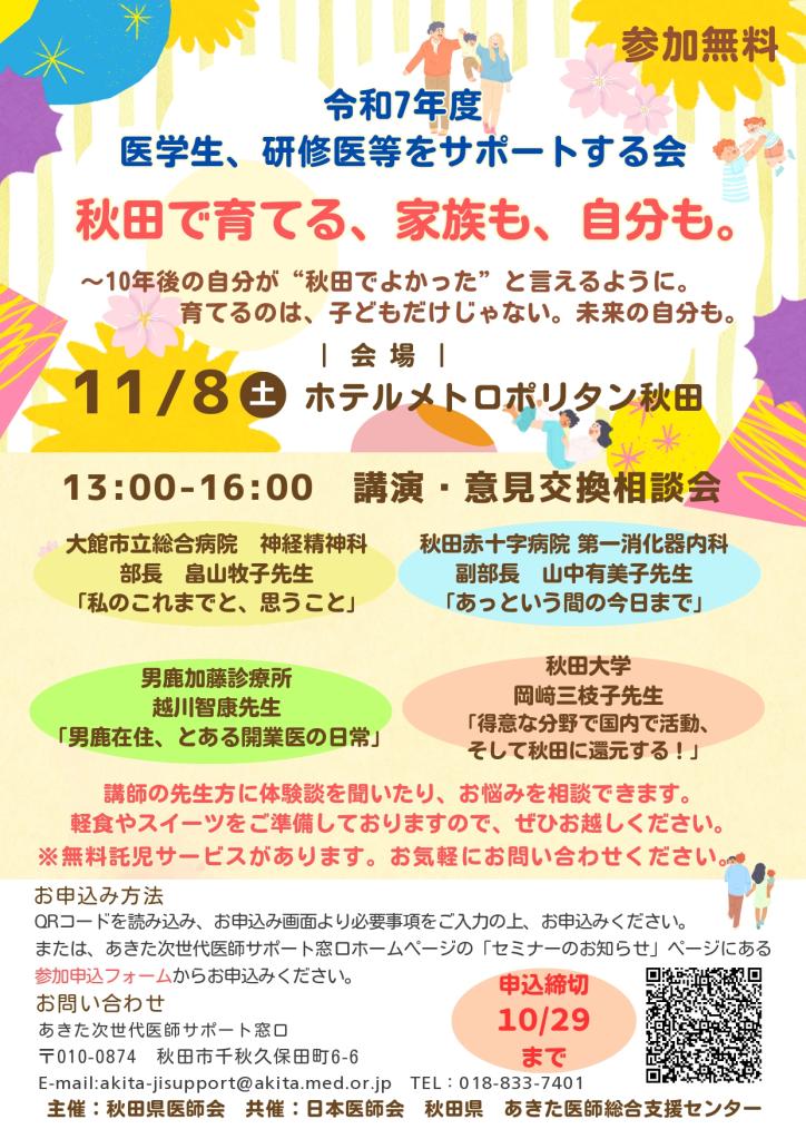 医師のライフステージに応じた多様な働き方を推進するための取組として、「令和7年度医学生、研修医等をサポートする会」が開催されます(秋田県医師会主催)。事前申込制となっておりますので、関心がある医学生、研修医の方はぜひお申込みの上御参加ください。