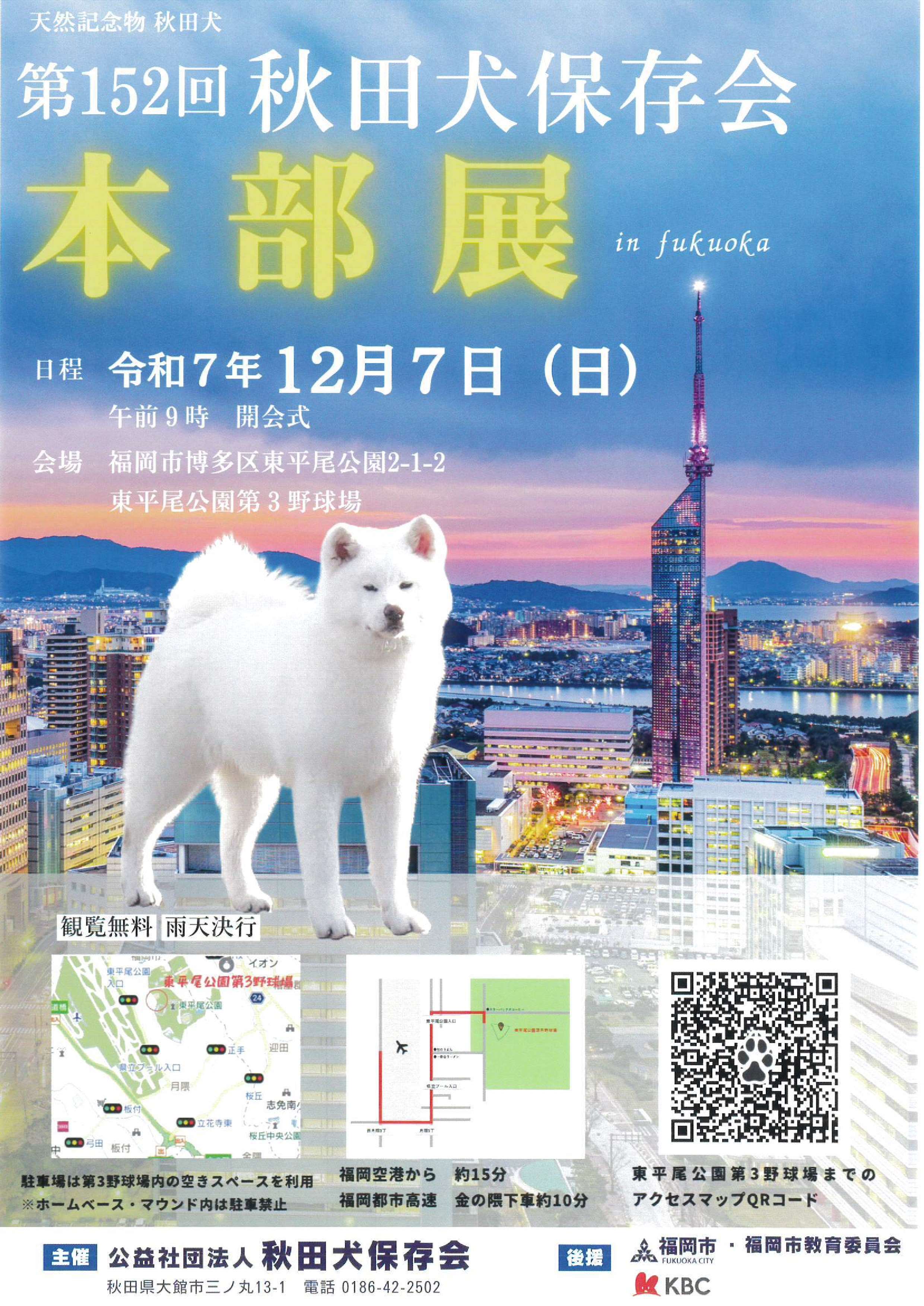 12月7日(日)に、福岡市博多区の東平尾公園第3野球場で開催される、秋田犬本部展が近づきました。