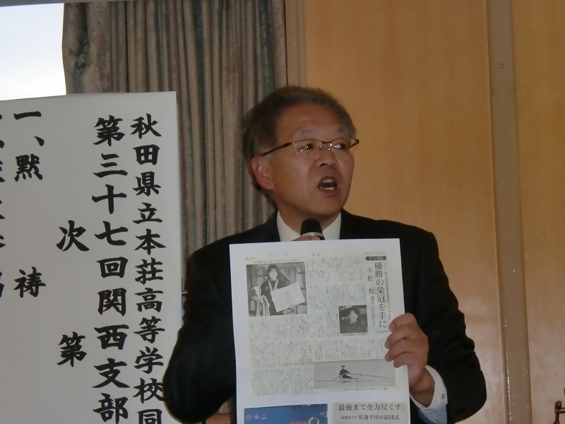 17時からの懇親会には、高橋校長先生、同窓会本会の村岡会長、秋田県大阪事務所の鎌田主幹、近畿秋田県人会の加藤会長をはじめ、秋田高校、秋田商業高校、由利高校、秋田南高校の僚校代表にも来賓としてご参加いただき、大阪芸大講師の岸本耕誌さん、民謡の梅若晶子さんや工藤支部長のお嬢様、同僚の方もご出席いただき、20数名で行われました。