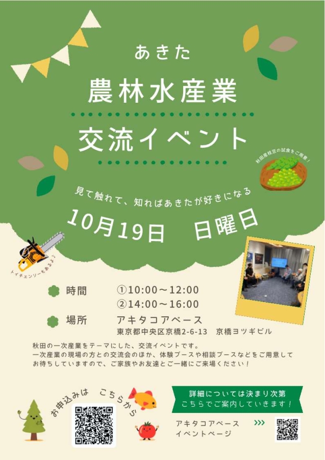 秋田の農業・林業・漁業の話をまるっと聞くことができて、移住相談もできる交流会を開催します。